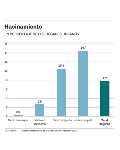 De la misma forma, el hacinamiento es padecido solo por el 0,5% de los profesionales medios, pero alcanza al 10,4% de los obreros integrados y al 14,4% de los obreros marginales.