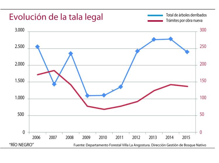 En los últimos 10 años se talaron legalmente en el ejido de Villa La Angostura 20.254 árboles: el equivalente a 67 hectáreas. Para graficar la superficie afectada debe multiplicarse por 12 la cancha de fútbol municipal del barrio Calafate.