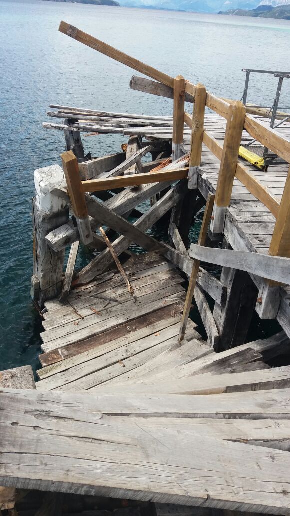 Prestadores que estaban en el lugar relataron que en una mala maniobra el catamarán Victoria del Lago rompió un sector del muelle histórico.