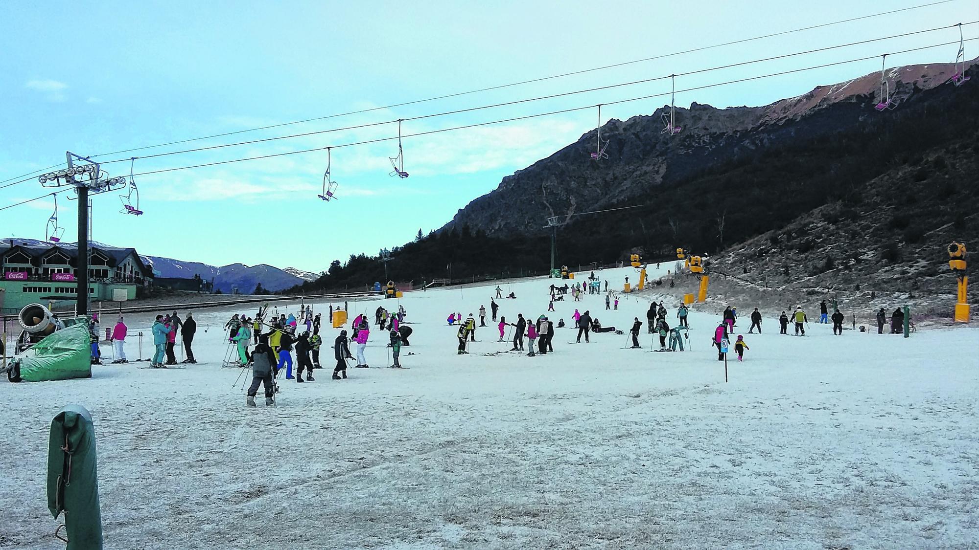 En el regreso, desde la aerosilla se ve a los principiantes dar sus primeros pasos con el esquí en Plaza Oertle (1.300 m) y otros en la Base: la montaña siempre da una chance de pasarla bien.