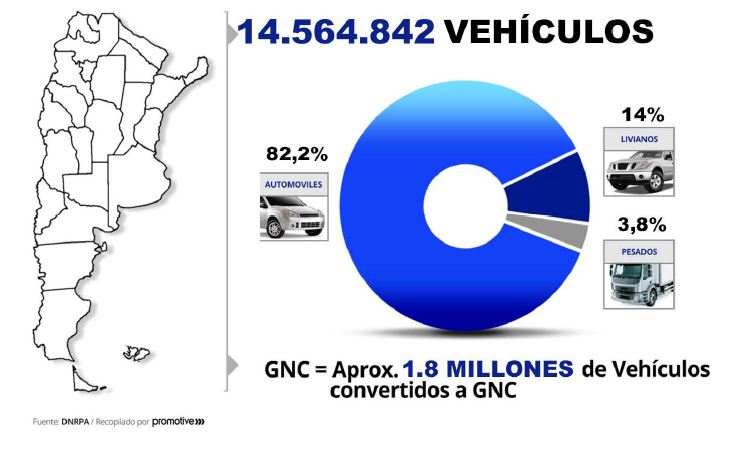 · La flota vehicular está conformada en un 82,2% por automóviles, un 14% de comerciales livianos y 3,8% de comerciales pesados, incluyendo camiones y ómnibus, sin considerar acoplados, remolques, motocicletas, maquinaria vial o agrícola.