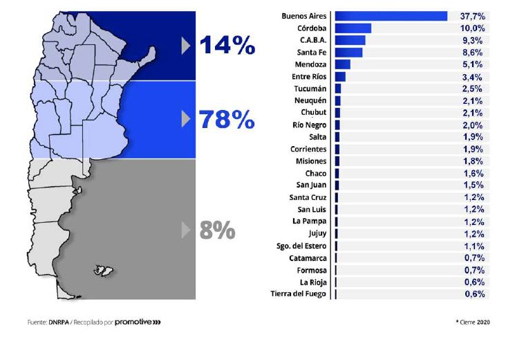 · El 47% de la flota circulante en 2020 en Argentina se encuentra concentrada en la provincia de Buenos Aires y CABA. La provincia de Córdoba posee la segunda mayor flota del país, y junto con Santa Fe y Mendoza suman el 23,7% de la flota total.