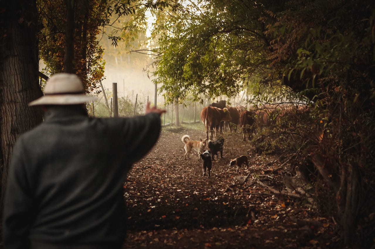 Ahí va don Carlos, avanza a paso firme acompañado por sus dos fieles laderos que ladran y mueven la cola a soltar las vacas que irán a pastar al campo como en aquellos viejos tiempos en los que a nadie se le hubiera ocurrido engordarlas en un corral al sur de La Pampa, donde se crió. Es una mañana otoñal de sol pleno que se filtra entre los álamos, los olivillos y los sauces cerca de la costa de un brazo del río Negro, en la isla ubicada a seis kilómetros de Cervantes en el corazón del Alto Valle. Ahí va, de botas, pañuelo al cuello, campera y el sombrero, la señal que esperan los perros para saber que saldrán de recorrida. “Cuando me lo pongo ya se dan cuenta que vamos a trabajar. Entienden todo. Les digo a la punta y van. Les digo atrás y van. Les digo den la vuelta y van. Saben lo que tienen que hacer. Son bien gauchos, unos compañeros impresionantes”, dice contento, la mirada a los ojos, la risa franca.