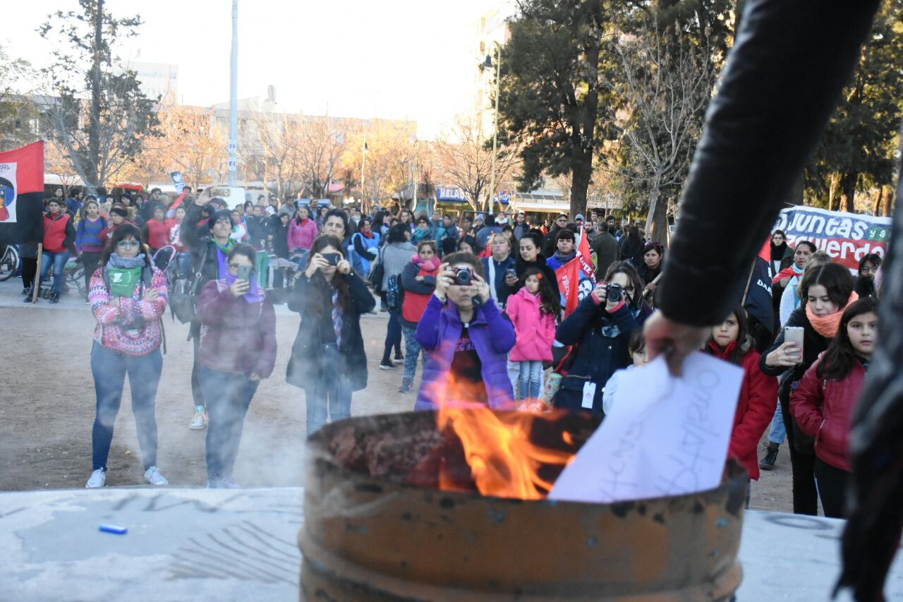 En el inicio en plaza San Martín, a modo simbólico, un tambor sirvió para quemar todo aquello que oprime del patriarcado. La asamblea Ni Una Menos Cipolletti realizó intervenciones y una radio abierta.