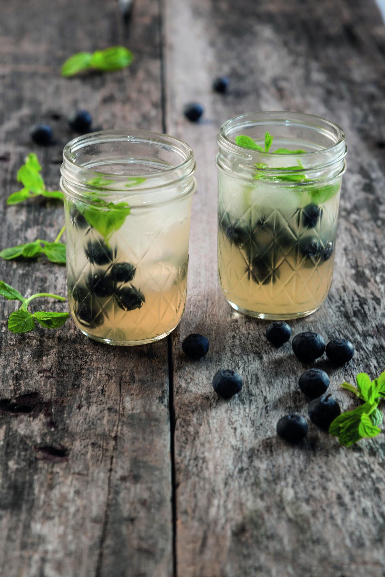 Colocar los arándanos en una cubetera, agregar agua y llevar al freezer. Hacer un jugo con las manzanas y mezclarlo con el jugo de limón. Verter todo en una jarra con el agua fría. Agregar el azúcar y mezclar. Al momento de servir, agregar los cubos de hielo con los arándanos.