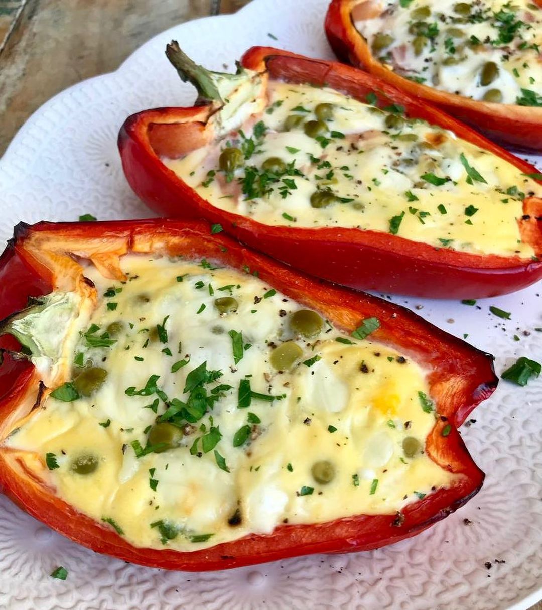 Morrón: cocinar al horno unos 20 minutos para que se ablande. Agregar arvejas, 1 feta de jamón (opcional), 1 huevo apenas batido en cada mitad, queso y llevar al horno. Pueden rellenar con lo que quieran.