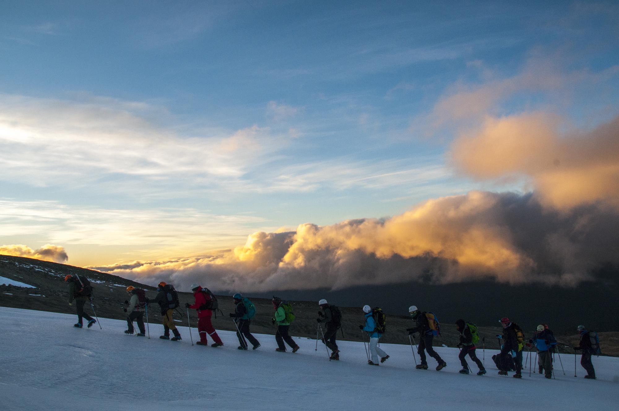 5:00 hs. Refugio El Caulle. Las linternas comienzan a encenderse. La temperatura es muy baja. Un desayuno bien caliente y sustancioso nos da la energía para comenzar a caminar de noche. Nos reunimos unos minutos fuera del refugio y avanzamos bajo las estrellas. El objetivo es llegar al cráter (2.240 msnm) en unas cuatro horas.