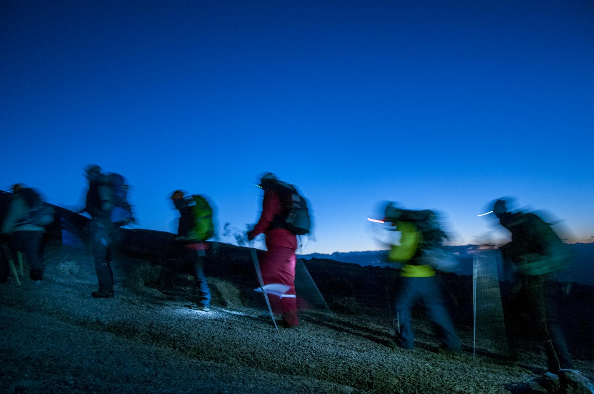 Apagamos nuestras linternas y contemplamos el paisaje mientras subimos. Las nubes nos acompañan.