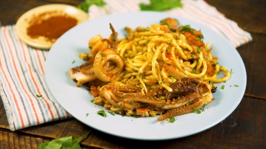 Limpiar los calamaretis, retirándoles la cabeza, los tentáculos, la piel externa color violácea y la aguja que se encuentra a lo largo del cuerpo. Darlo vuelta con cuidado, limpiar el lado interno y volver a darlo vuelta con mucha paciencia. Ahora está listo para ser cortado en rodajas de 1 cm.