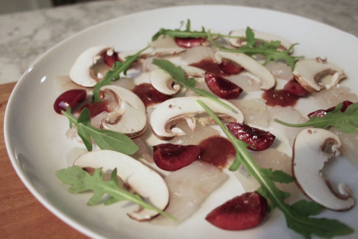 Pescado blanco curado y cerezas de Soledad Nardelli
