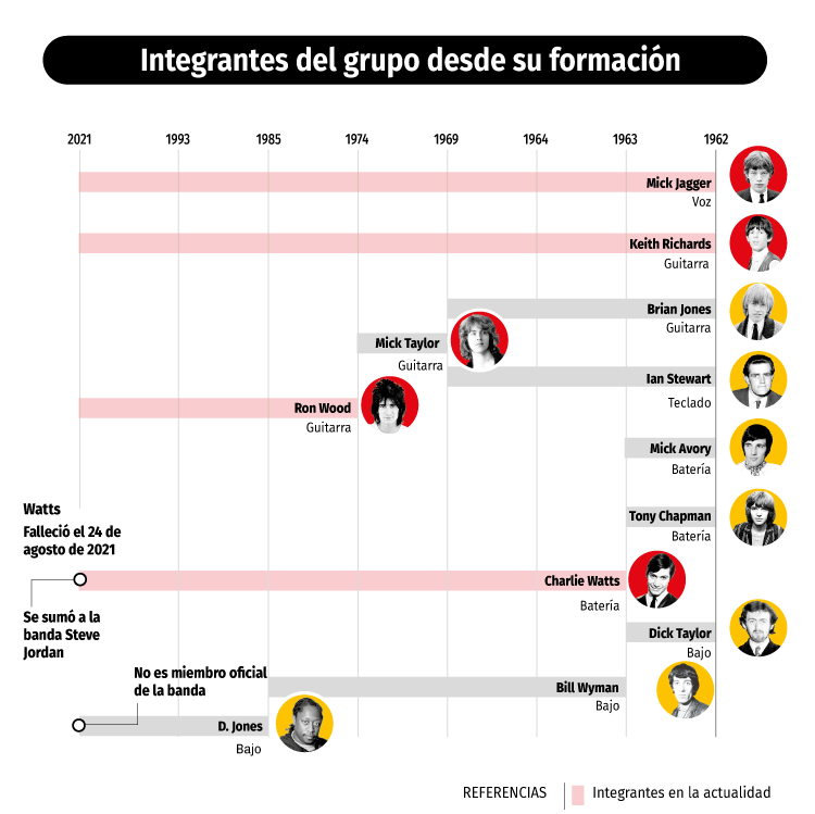 Ahora, después de la muerte de Charlie Watts, del cuarteto actual de los Stones solo quedan Jagger, Richards y  Wood, ya que Bill Wyman dejó el grupo en 1993, cansado del ajetreo.