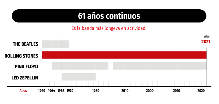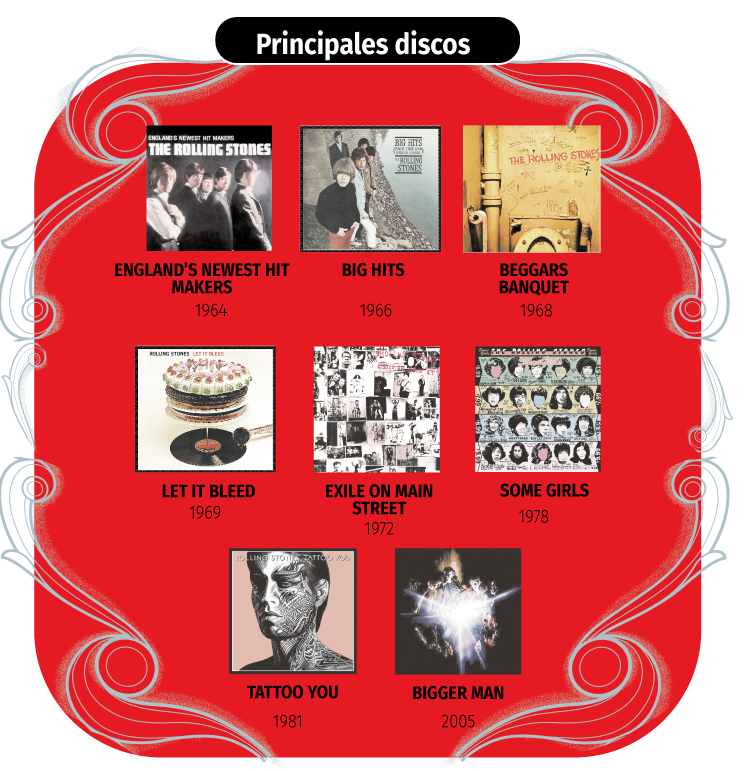 23 álbumes : los Stones publicaron 23 álbumes de estudio (25 en Estados Unidos), y sus ventas acumuladas se estiman en más de 200 millones . El grupo no pasa por el estudio para grabar temas originales desde 2005, cuando publicó A Bigger Band. Su último disco hasta la fecha, Blue and Lonesome, de 2016, son versiones de estándares de blues. Este año relanzan Tatoo You, un disco icónico, que cumple 40 años.