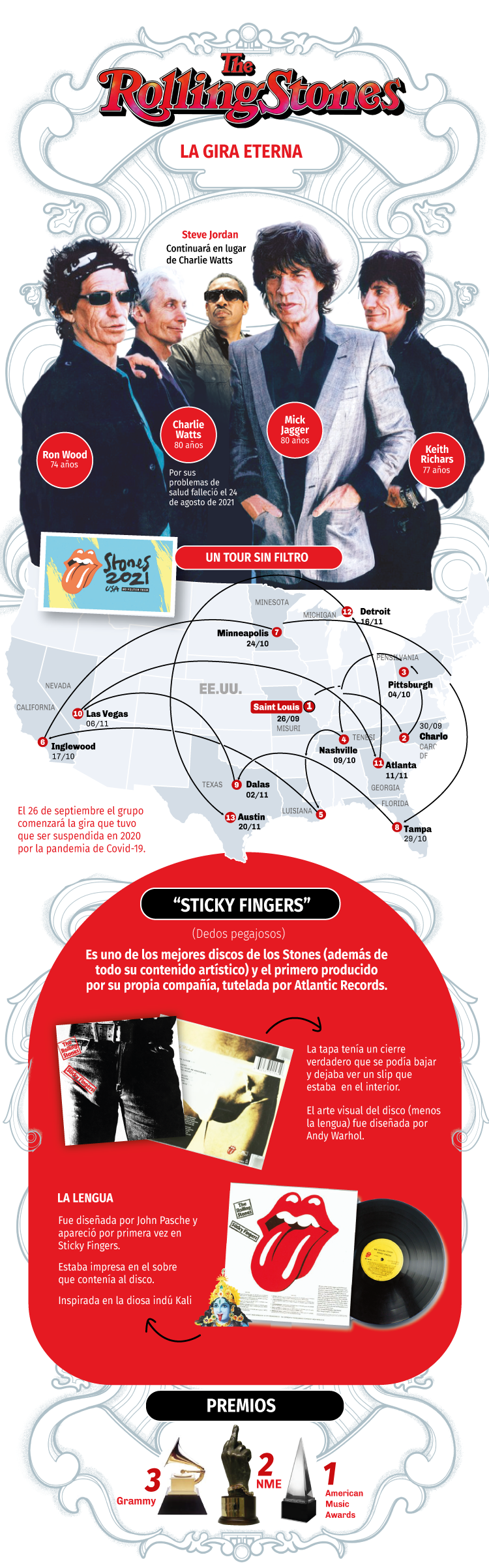 Hoy, a las 7.30 pm, en el Domo de St. Louis Missouri, la banda que lleva 61 años en el escenario, y que perdió a Charlie Watts, inicia su gira No Filter 2021, que fue demorada por la pandemia.