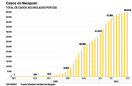 En Neuquén los casos confirmados llegaron a 64.915, un 17,5% más que en su provincia vecina. No obstante, la cantidad de fallecidos hasta el momento es menor, alcanzando hasta el viernes las 1.195 personas.