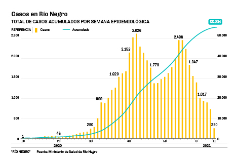 Desde el último día de “normalidad” hasta el 19 de marzo de este año, los casos positivos acumulados en Río Negro fueron 55.231, con 1.300 fallecidos.