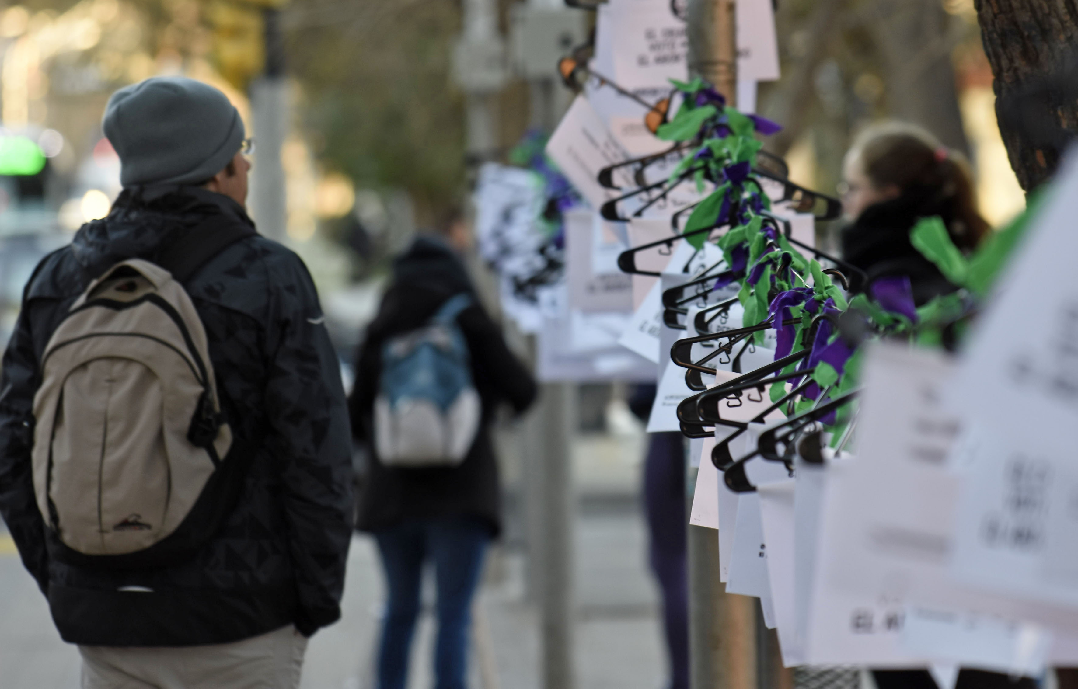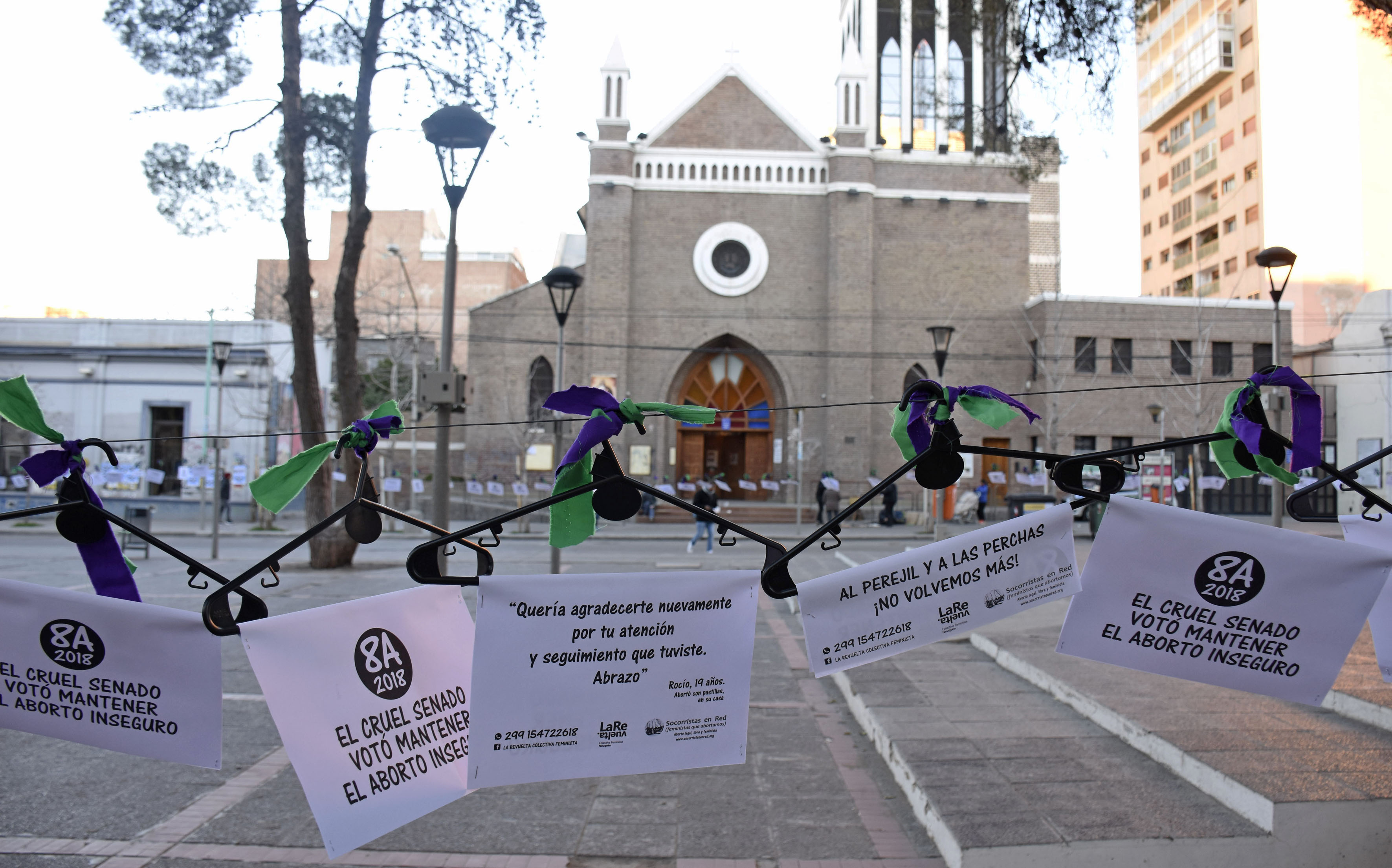 Las perchas fueron colgadas frente a la Catedral con retazos de tela verde y violeta, que refleja la campaña permanente por la legalización del aborto. El violeta es el color con el que se identifica el movimiento feminista.