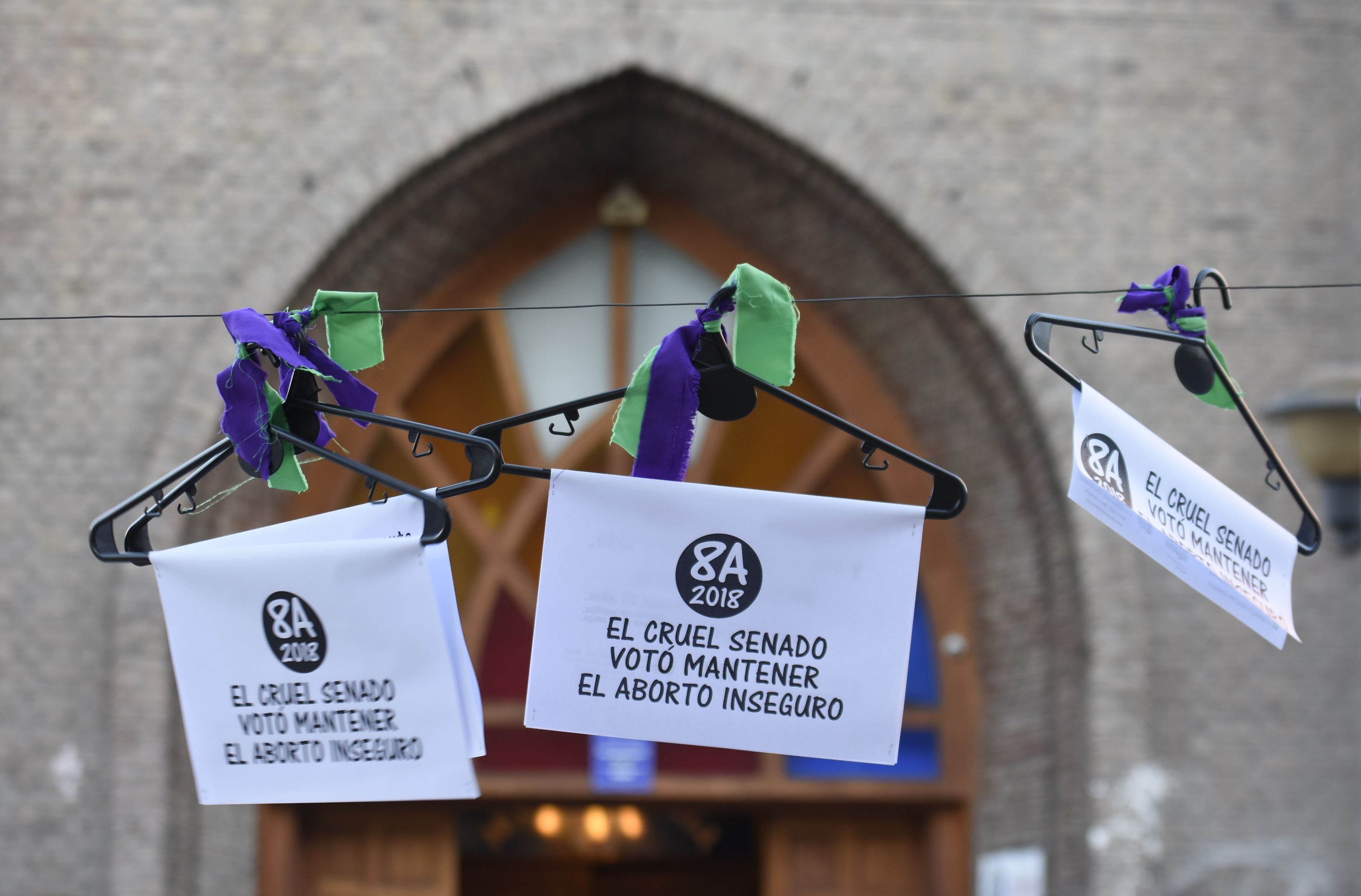 Aparecieron colgadas frente a la Catedral de la capital, como referencia a uno de los métodos que se usan para interrumpir embarazos.