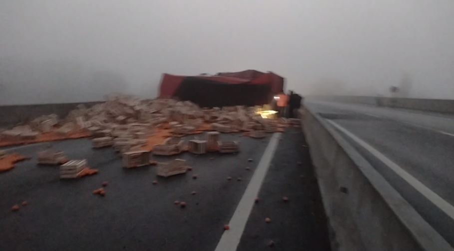 De acuerdo a fuentes policiales, eran dos los camiones con citrus que habían partido de la región de Salto Grande, los cuales circulaban cerca de las 7 de la mañana por esa zona. Por causas que se deberán establecer, el rodado que iba delante hizo una especie de trompo y quedó atravesado sobre la cinta asfáltica, volcando gran parte de su carga de citrus de su acoplado. Como dato a tener en cuenta, sobre la cinta asfáltica se había formado una fina capa de hielo, lo que podría haber originado el accidente.
