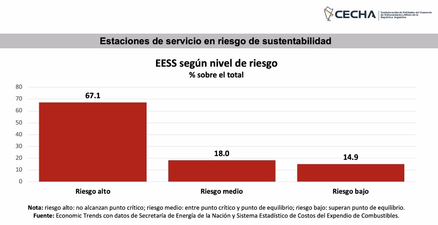 El presidente de Economic Trends, Gaston Utrera, detalló que el estudio que realizaron arrojó que el 67,1% de las estaciones de servicio del país están trabajando a pérdida, el 18% está en una situación de riesgo medio, en la que no pierden pero que tampoco tienen una ganancia como para reponer equipos, mientras que solo el 14,9% está logrando tener una rentabilidad superior al 3%.