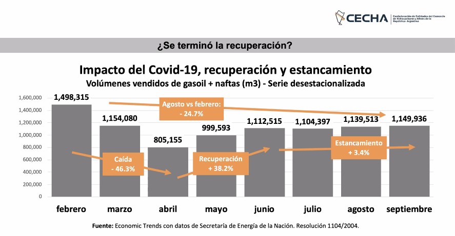 Los últimos registros de ventas de combustibles marcaron que en septiembre se evidenció un amesatamiento, ya que las ventas de gasoil mejoraron apenas un 0,1% y las de naftas un 2,4%, pero acumulando aún una caída del 24,7% con respecto al nivel de febrero.