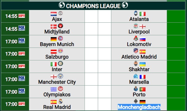Los otros que se juegan algo muy importante son los dos equipos de Madrid, ya que Atlético y Real tienen chances de quedar afuera. El equipo del Cholo (6 puntos) visita al Salzburgo (4) en la zona A y le basta con la igualdad, mientras que el Real (7) será local del Monchengladbach (9) por el grupo B por ESPN 2. El Merengue tiene puesta la oreja en lo que ocurra con Inter (5) y Shakhtar (7) en Italia por ESPN 3.