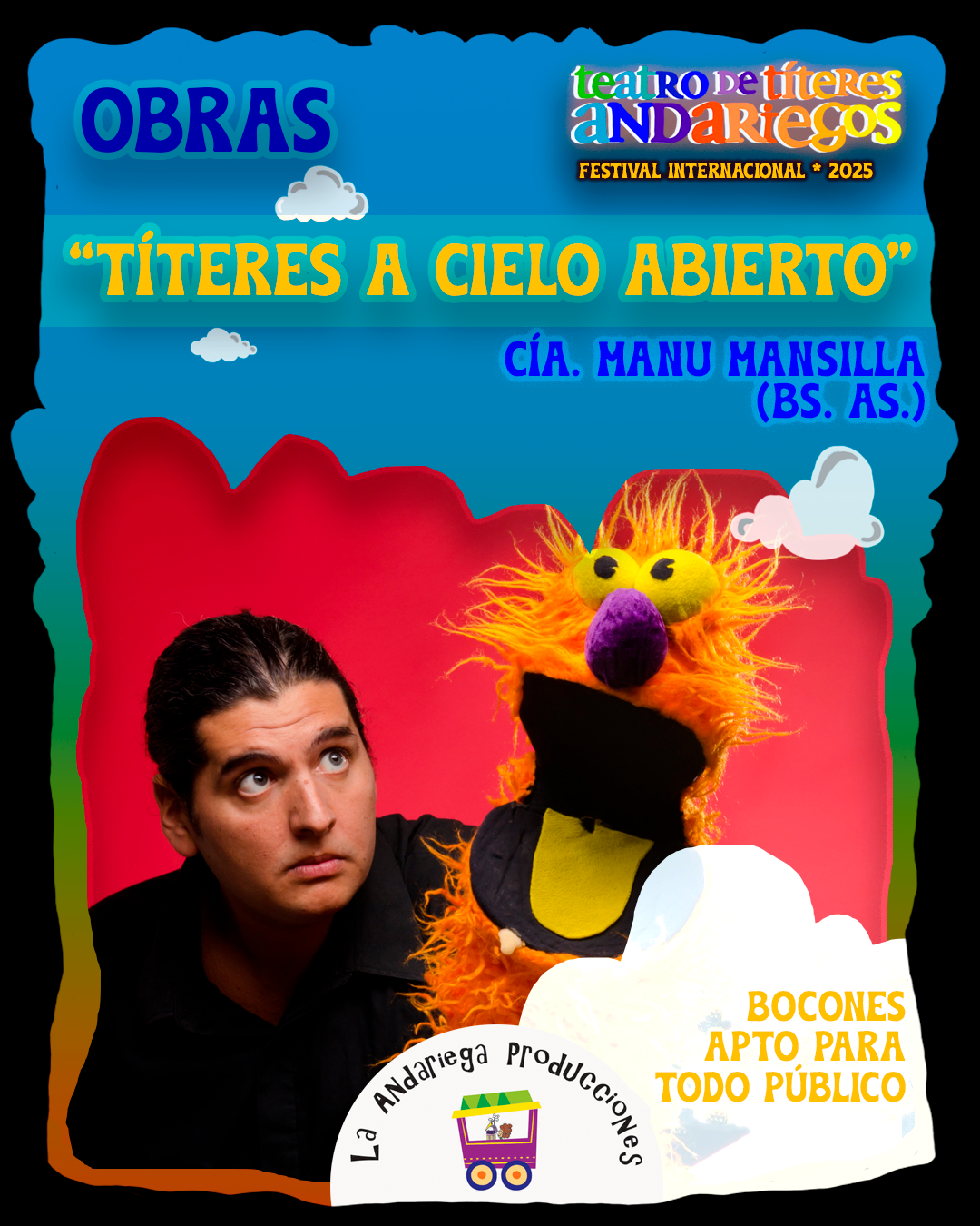 OBRA "A CIELO ABIERTO" 📍 Cía. Manu Mansilla 👨👩👧👦 Para toda la familia ⏳ 50 minutos de pura magia Día sábado 10/05 🕣 16:30 📌 LUGAR Usina Cultural del Cívico (Centro Cívico, BRC) @bibliotecapopularsarmiento DÍA domingo 11/05 🕣 17:00 📌 Campus de Artes y Música Bariloche (Vivaldi 1000, BRC) @musicambariloche DÍA sábado 17/05 🕣 18:00 📌 Moma Multiespacio - Traful 210, Melipal - @moma_multiespacio ✨ Tres historias, tres estilos: Un monstruo tierno que no asusta a nadie 👹❤️ Un pandillero con planes locos de conquista 😆🎭 Un títere rebelde que desafía a su titiritero 🤹♂️🔥 🎉 ¡Improvisación + interacción = cada función es ÚNICA! 🤣 Humor, sorpresas y mucha complicidad con el público. Festival Internacional de Teatro de Títeres Andariegos 🍄🎏 🗓️ Del 9 al 18 de Mayo 📍 Bariloche, Dina Huapi, Villa La Angostura, Fiske Menuco (Gral. Roca) 🔍 Más info: https://www.titeresandariegos.ar/