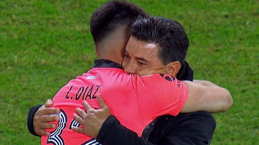 Antes de las ejecuciones, el entrenador de River Marcelo Gallardo no quiso dejar pasar la enorme tarea de Díaz y le dio un abrazo con el que dejó en claro su satisfacción.