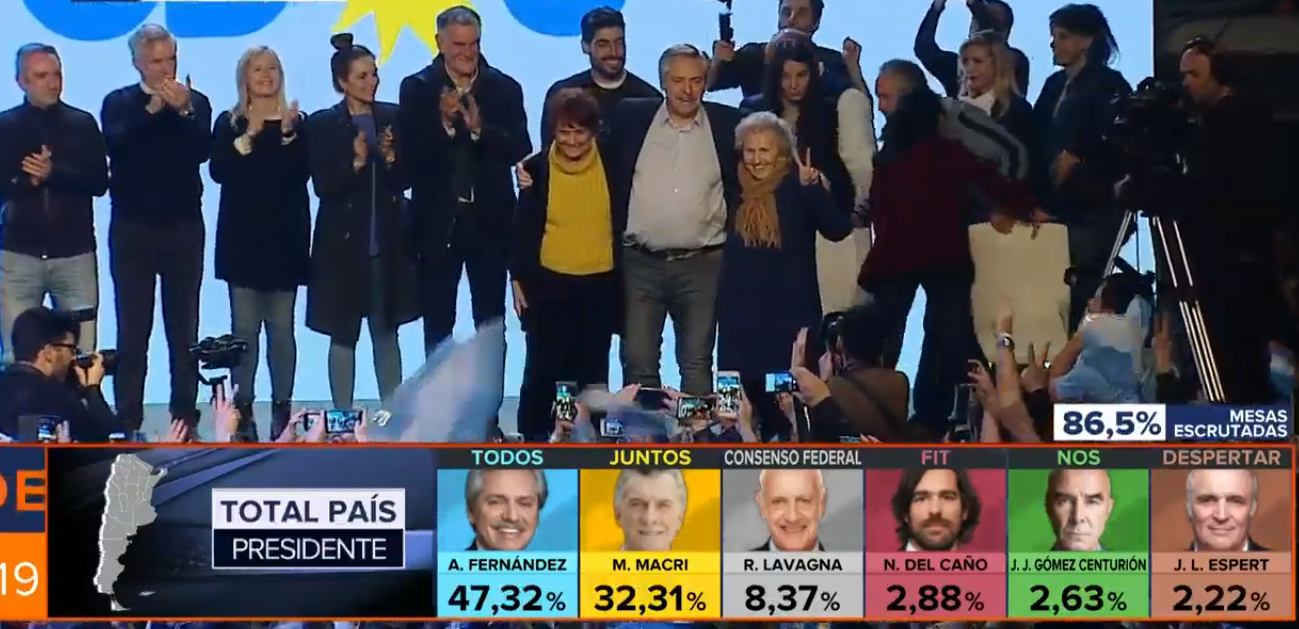 Con más del 80 por ciento de votos escrutados, el candidato Alberto Fernández, por el Frente de Todos, lideraba el conteo de las elecciones primarias con quince puntos de diferencia sobre el actual presidente Mauricio Macri.