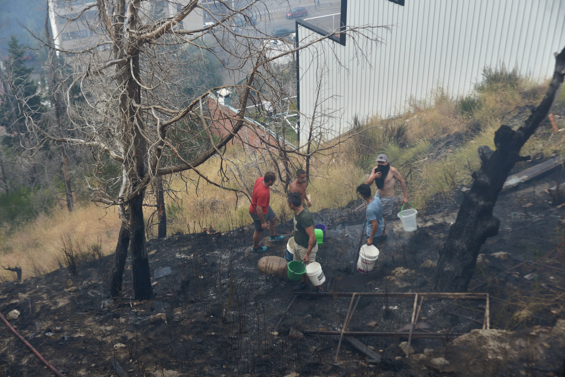 En el combate de las llamas intervinieron bomberos por tierra (desde las calles Salta y Tucumán) y un helicóptero con balde que recarga en el lago Nahuel Huapi, que hizo decenas de descargas.
