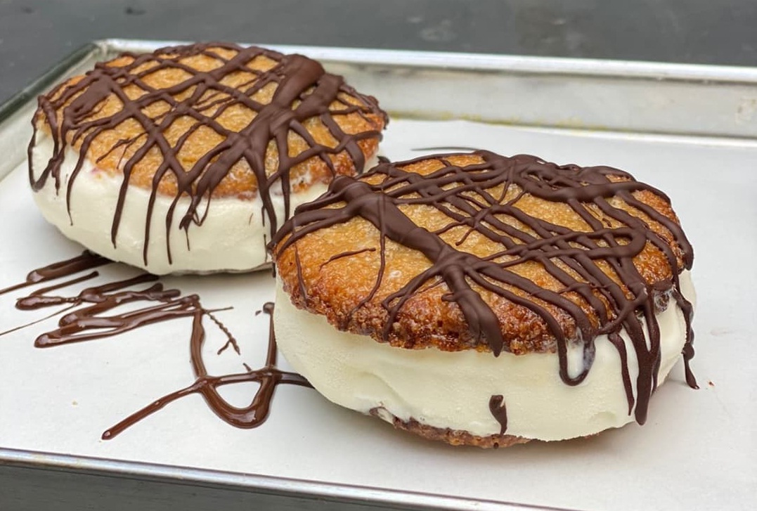 Mezclar todo en un bol, formar bolitas, colocar en una placa con papel manteca enmantecado y aplastar un poco. Llevar al horno por 7 minutos aproximadamente a 180° C. Una vez frías, retirar de la bandeja y rellenar con una bocha de helado de crema sin gluten, otras con helado de dulce de leche y otras con helado de frambuesa. Bañar en chocolate y llevar al freezer.