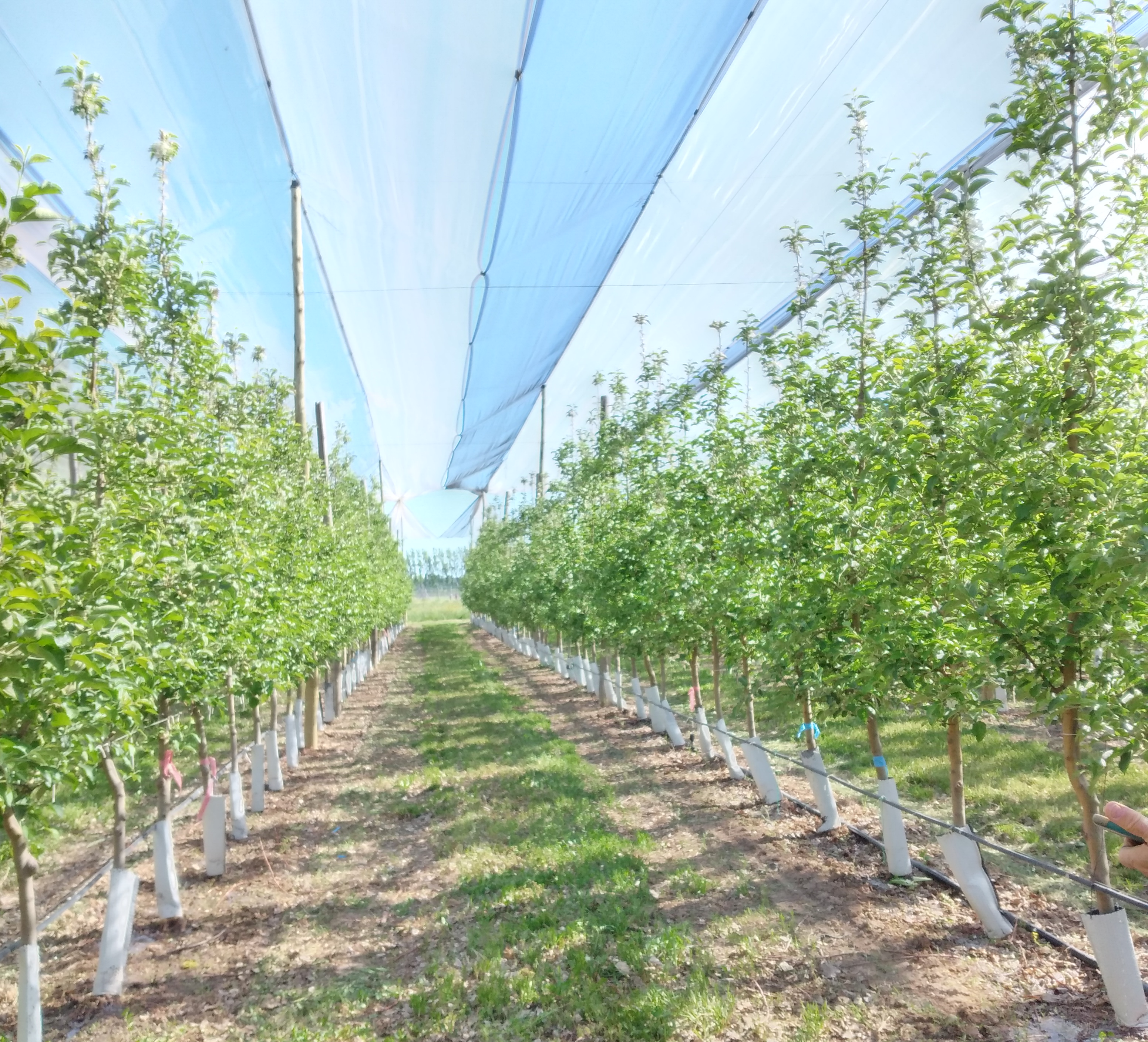 Las mallas antigranizo, de uso extendido en la región en las últimas temporadas. Además de ser utilizadas para resguardar los montes frutales de las precipitaciones, esta tecnología reduce hasta un 65% el daño por sol en la manzana y la pera.