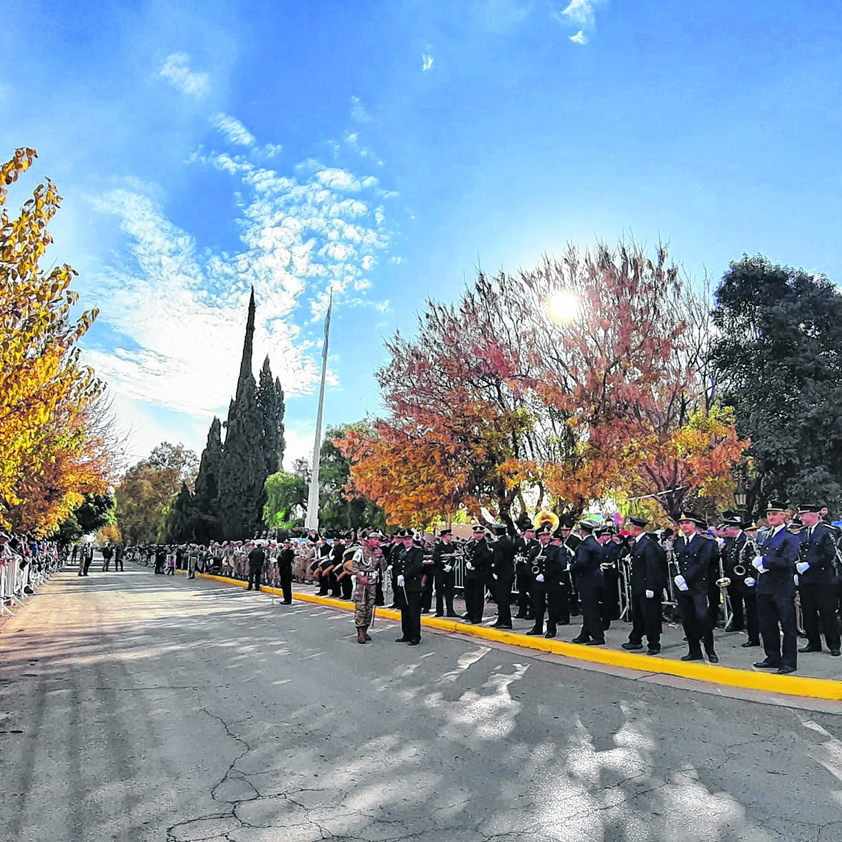 Luego comenzó el colorido desfile cívico-militar donde marcharon unas 80 instituciones entre ellas escuelas deportivas, talleres culturales, academias de danzas, clubes sociales, escuelas de música, todas los jardines, primarias, secundarias y grupos de scouts, además las fuerzas de seguridad y otros empleados públicos.
