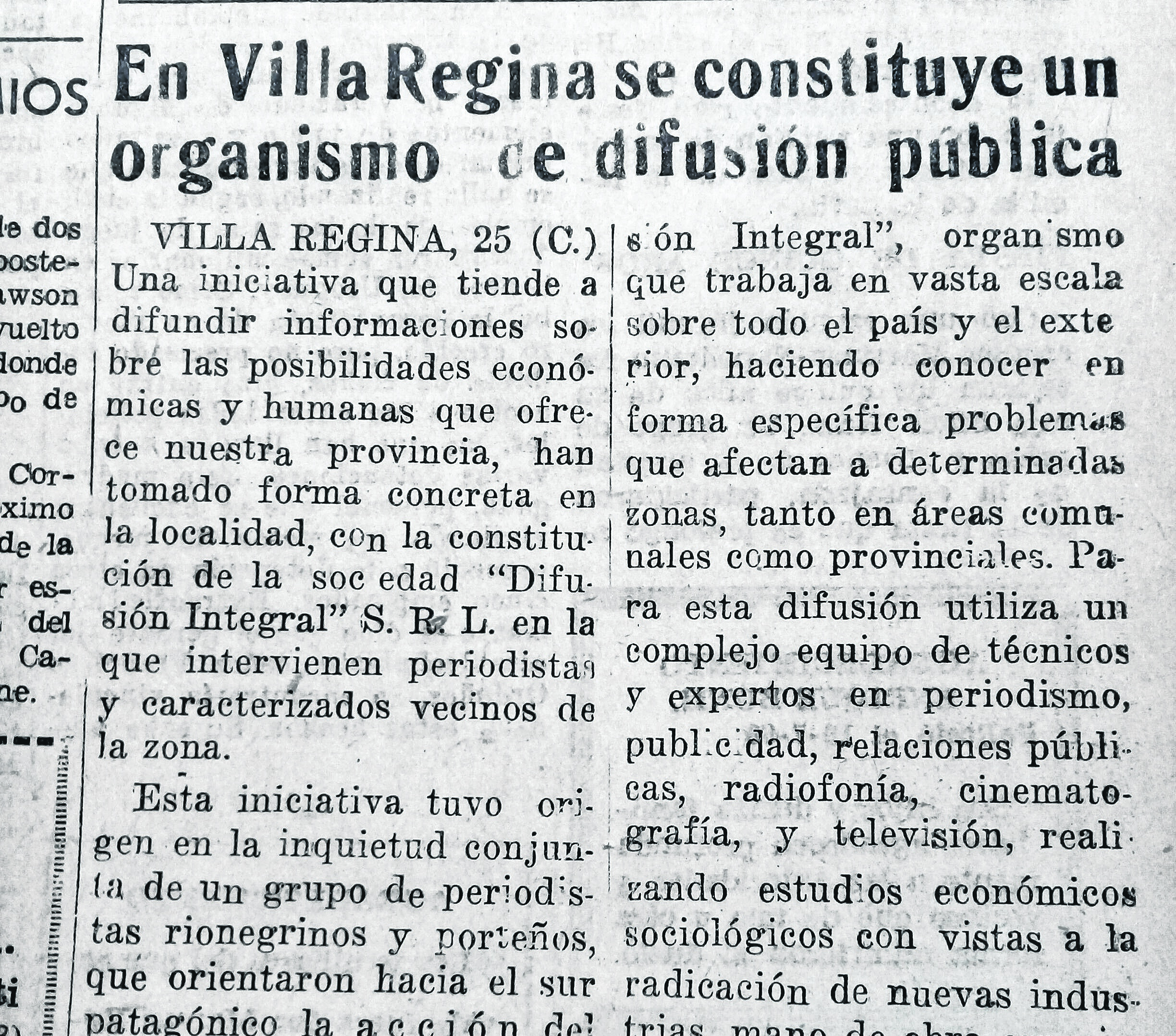 Se constituye en Villa Regina la sociedad “Difusión Integral SRL”, conformada por periodistas y destacados vecinos de la zona.