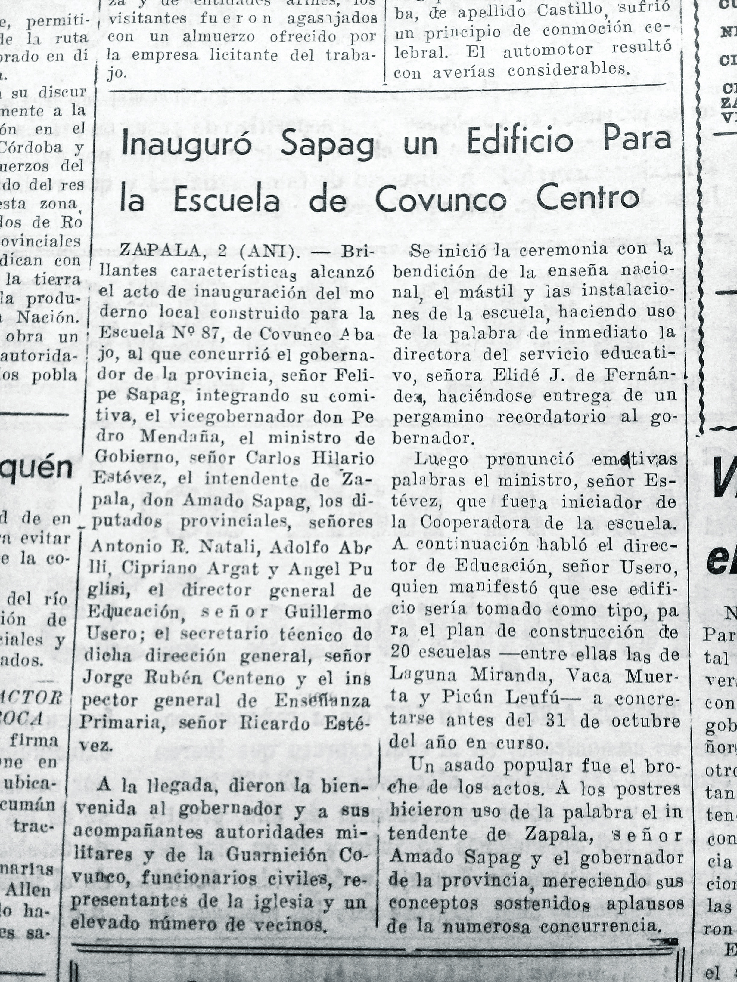 2 de junio de 1964: El gobernador Felipe Sapag inaugura el edificio de la Escuela N° 87 de Covunco Abajo. Un asado popular fue el broche de oro de los actos.
