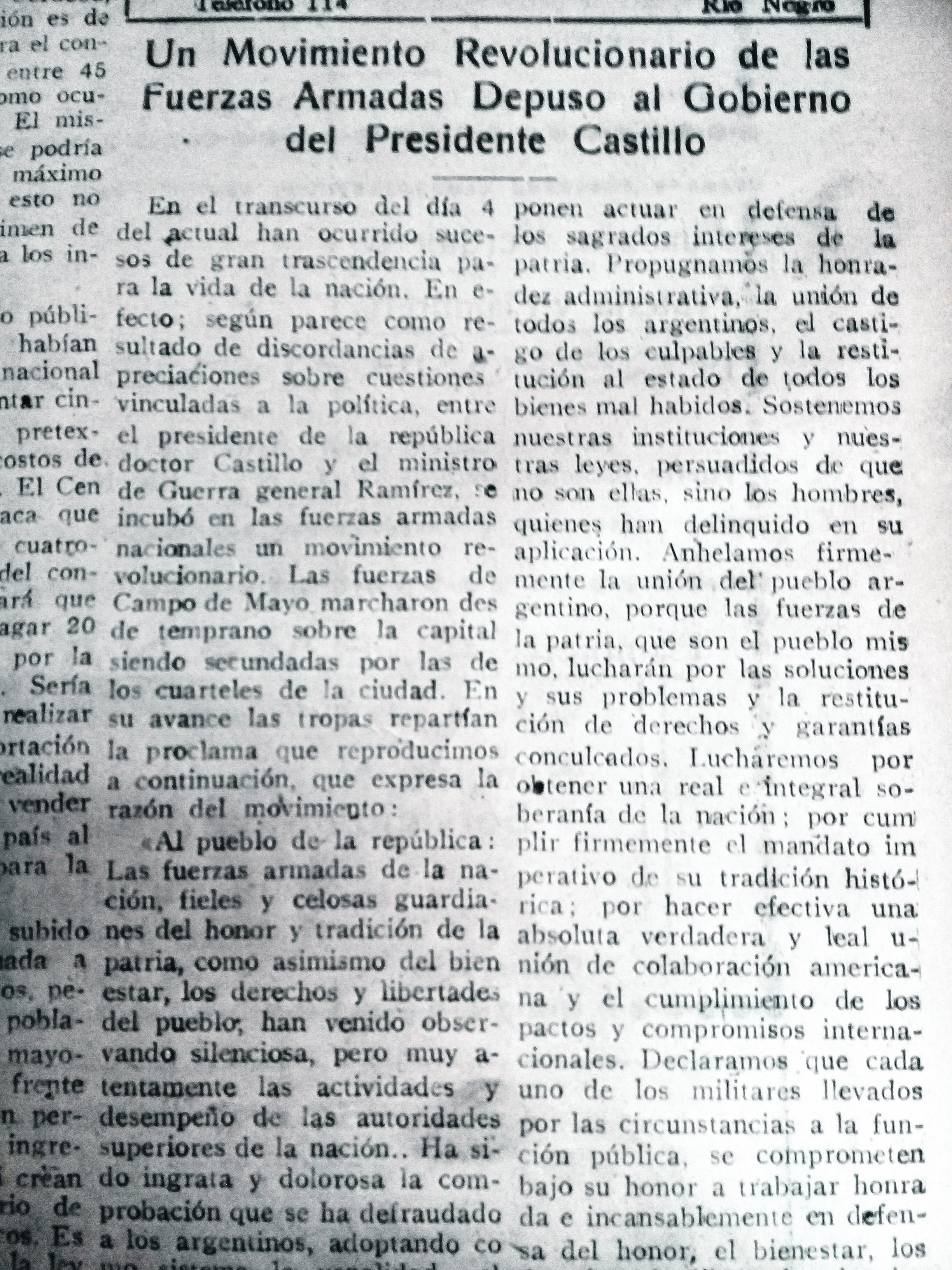 Pero Rawson no duró mucho en el puesto porque el día 7 fue desplazado por el general Pedro Pablo Ramírez, quien asumió la jefatura del régimen militar el día 8, y en su discurso pidió “la colaboración para llevar a feliz término la obra de depuración que nos hemos propuesto realizar”.