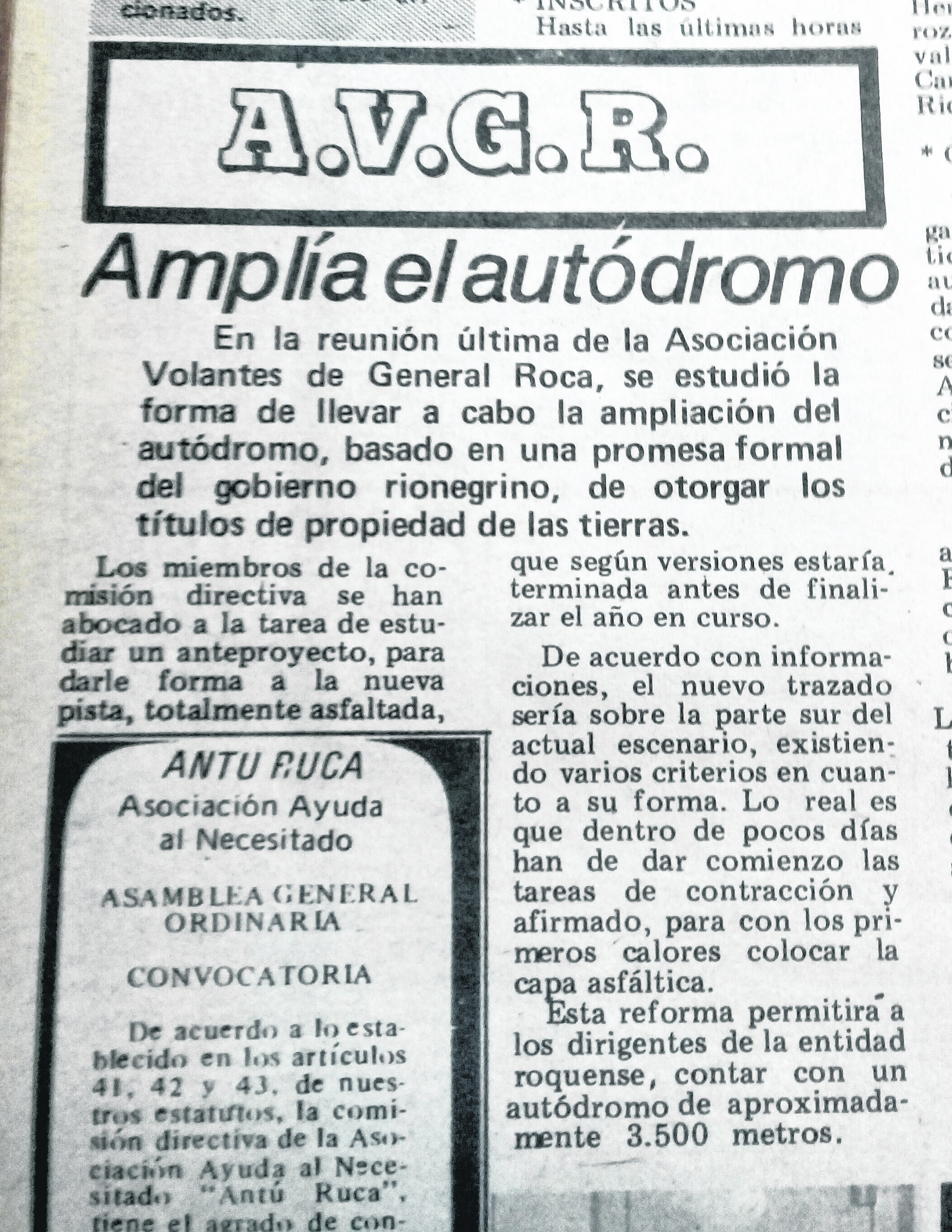 24 de mayo de 1972: En la reunión de la Asociación Volantes de General Roca, es estudió la forma de llevar a cabo la ampliación del autódromo local, basado en la promesa formal del gobierno rionegrino de otorgar los títulos de propiedad de las tierras.