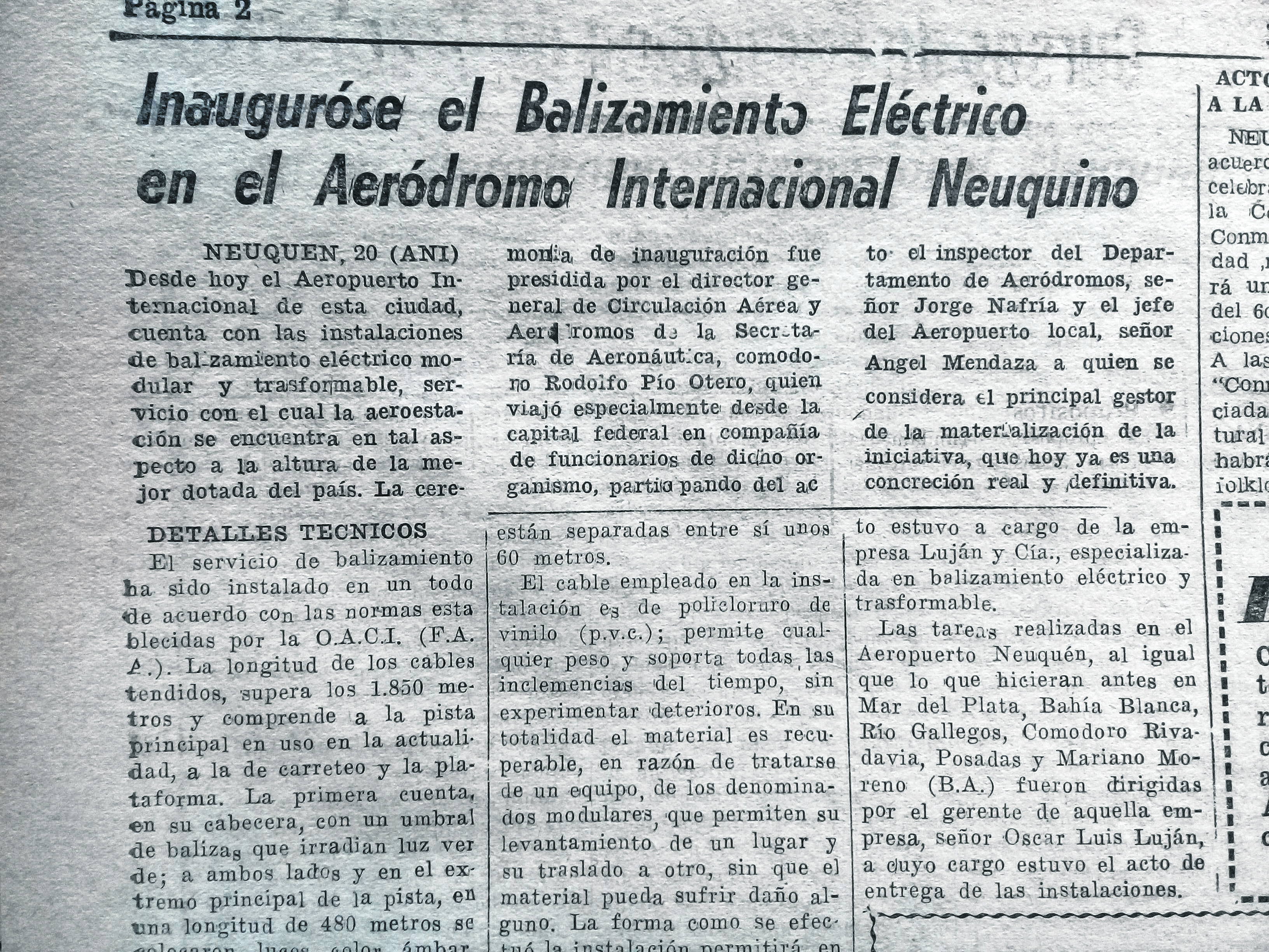20 de abril de 1964: Se deja inaugurado el balizamiento eléctrico del aeropuerto internacional de Neuquén, colocando a la aeroestación como la mejor dotada electrónicamente del país. La instalación del servicio estuvo a cargo de la empresa Luján y Cía., especializada en balizamiento electrónico.