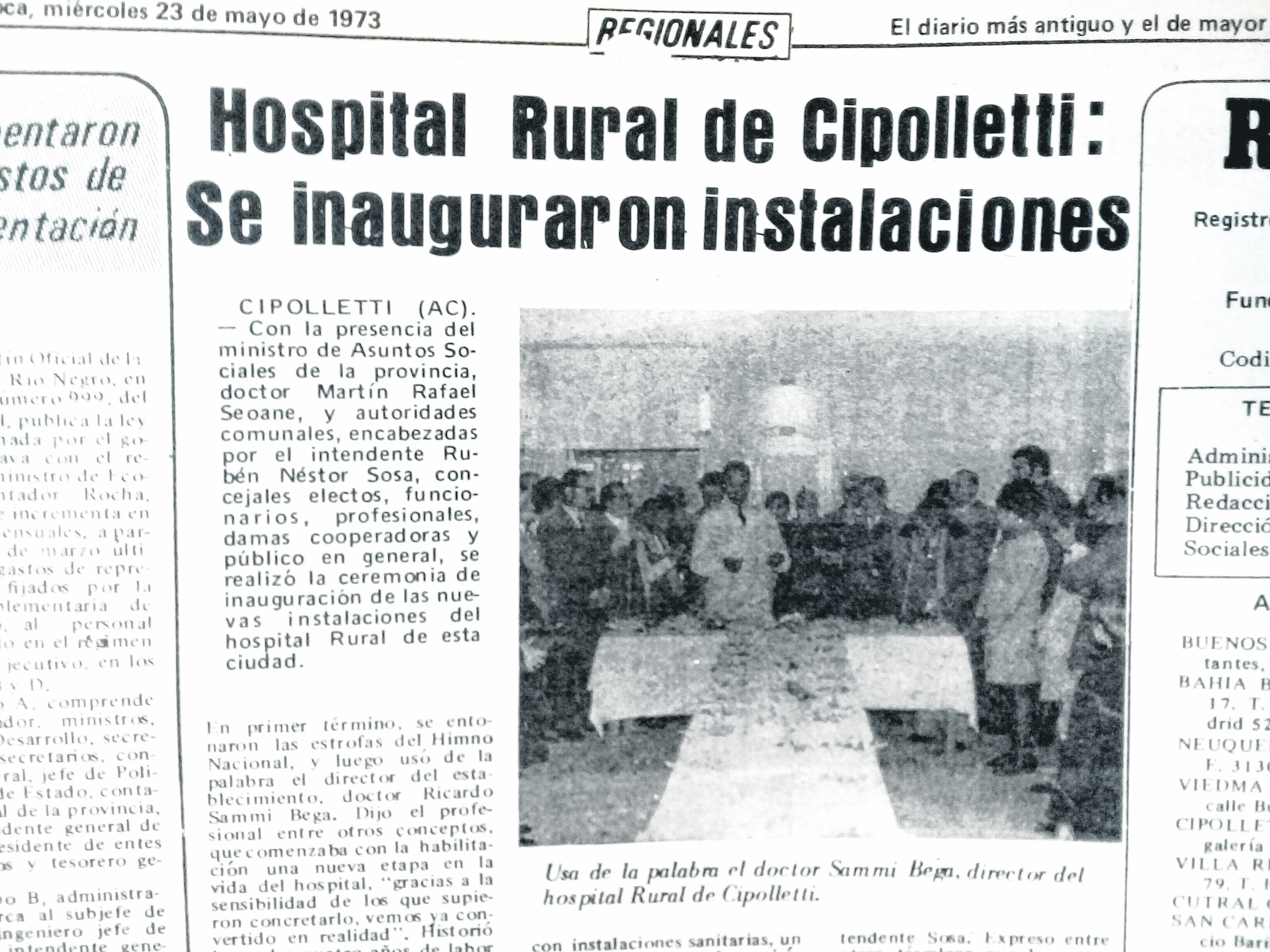 22 de mayo de 1973: Se realizó la ceremonia de inauguración de las nuevas instalaciones del hospital Rural de Cipolletti, con la presencia del ministro de asuntos Sociales de la provincia, Martín Seoane y autoridades municipales encabezadas por el intendente Rubén Sosa.