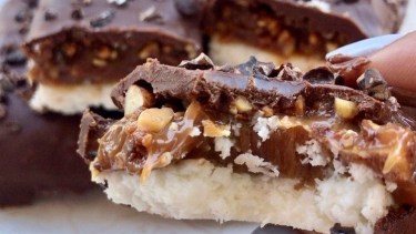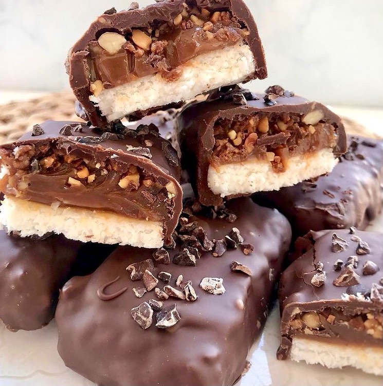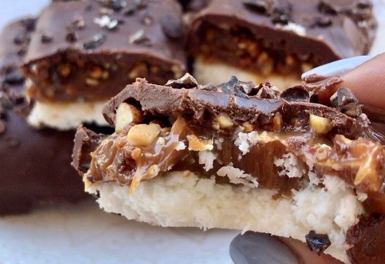 Alta golosina de coco, dulce de leche, maní y chocolate