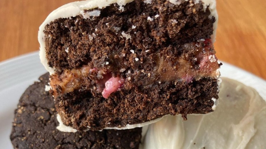 Colocar los ingredientes secos en un bol y luego los líquidos de a poco hasta formar una masa. Estiramos la masa de 1 cm de espesor y cortamos tapitas de 5 cm de diámetro y llevamos al horno por 15 minutos. Mezclamos la mantequilla y frutos rojos. Luego rellenamos las tapitas y bañamos con chocolate amargo o blanco.