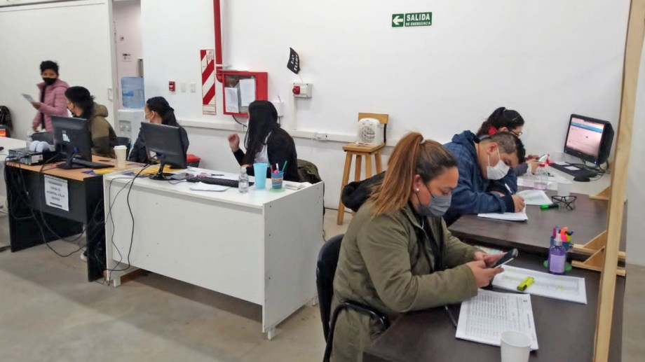 Un grupo de alumnos de la UNRN colabora con la carga de datos y atención de consultas de personas que asisten al vacunatorio covid de Villa Regina. La participación de los estudiantes es parte de un programa de la universidad.