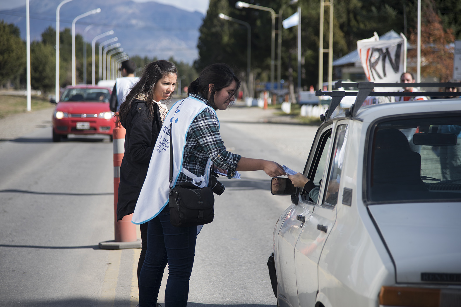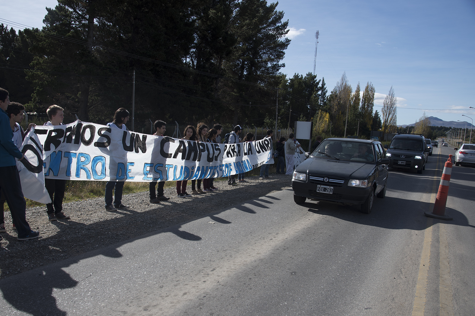 Por eso, en una asamblea interclautros meses atrás, la comunidad educativa de la UNRN decidió visibilizar el reclamo que tuvo hoy su actividad central con una manifestación con pancartas y folletos en el puesto de la Policía Caminera, en el acceso Este, y el posterior abrazo al edificio abandonado ubicado a unos 400 metros de la ruta, en el barrio Las Marías, donde todavía cuelga el cartel celeste que indica un plazo de ejecución de 30 meses.