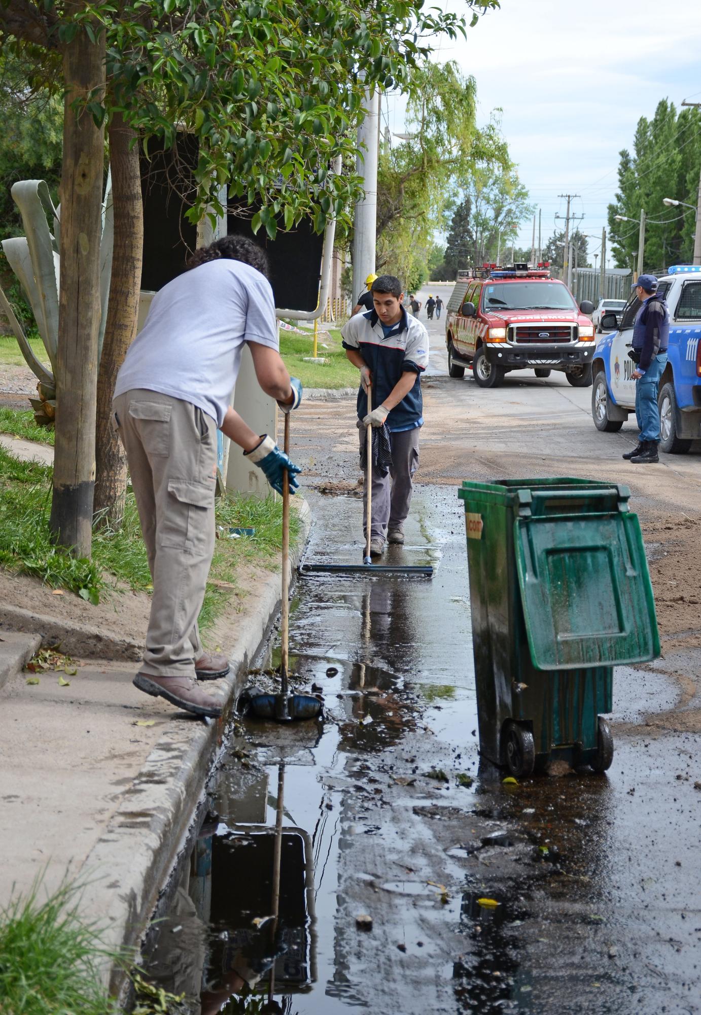 El encargado de una concesionaria que se encuentra en la zona, Fabián Amra, explicó que durante la madrugada se rompió un caño de agua provocando que los depósitos de aceite usado rebalsaran y llegaran a la calle.