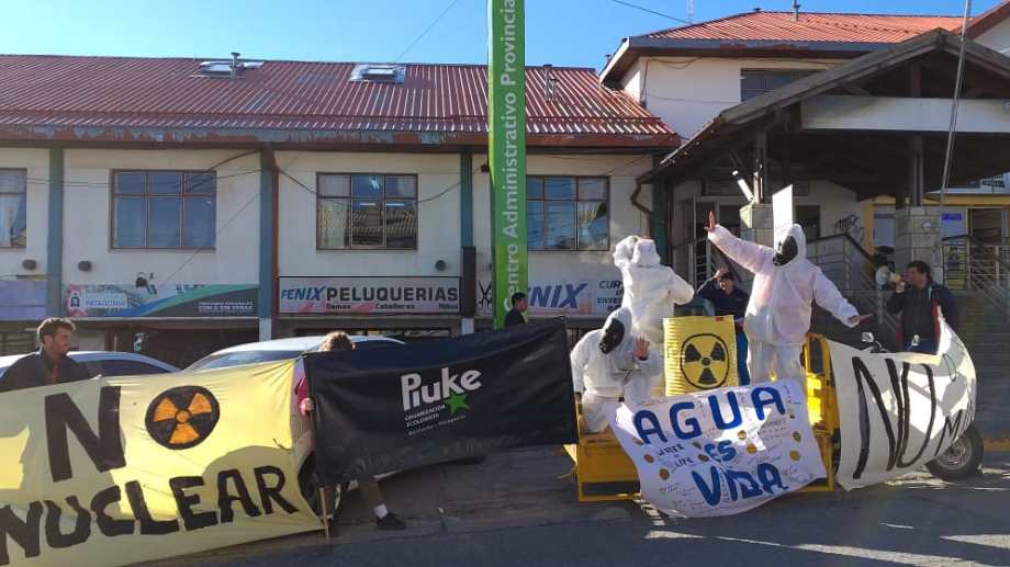 Los integrantes de la organización ambientalisa Piuké protestaron frente al Centro Administrativo Provincial contra el proyecto minero "Amarillo Grande" de la empresa canadiense Blue Sky Uranium Corporation en una zona cercana a Valcheta.