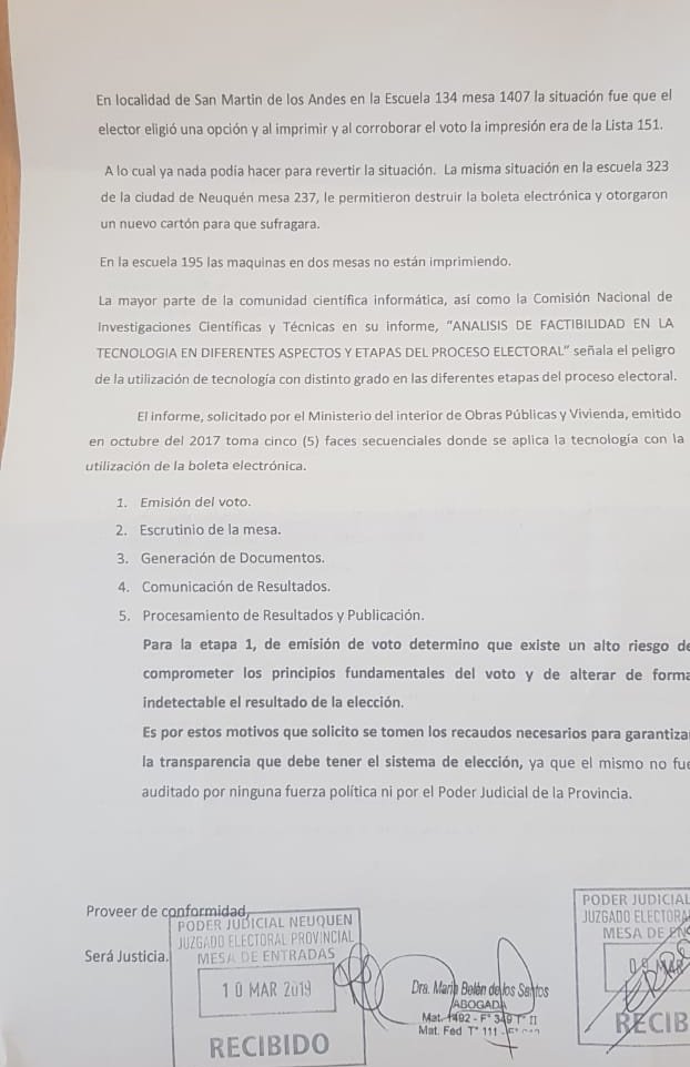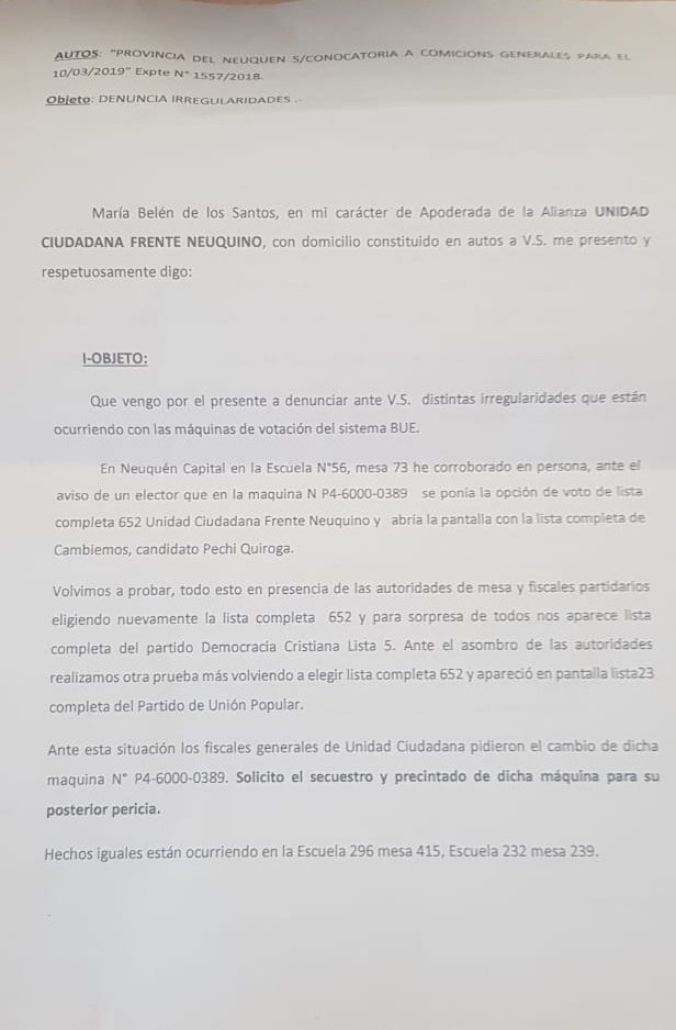 Las aclaraciones surgieron a partir de una conferencia de prensa que se desarrolló este mediodía donde la alianza «Unidad Ciudadana-Frente Neuquino» realizó una presentación en la justicia electoral afirmando que se registraron irregularidades con el sistema de boleta única electrónica. Aseguraron que en escuelas tanto del interior como de la capital, hubo casos en los que los electores votaron por Ramón Rioseco pero en el papel se imprimía la opción de Omar Gutiérrez.