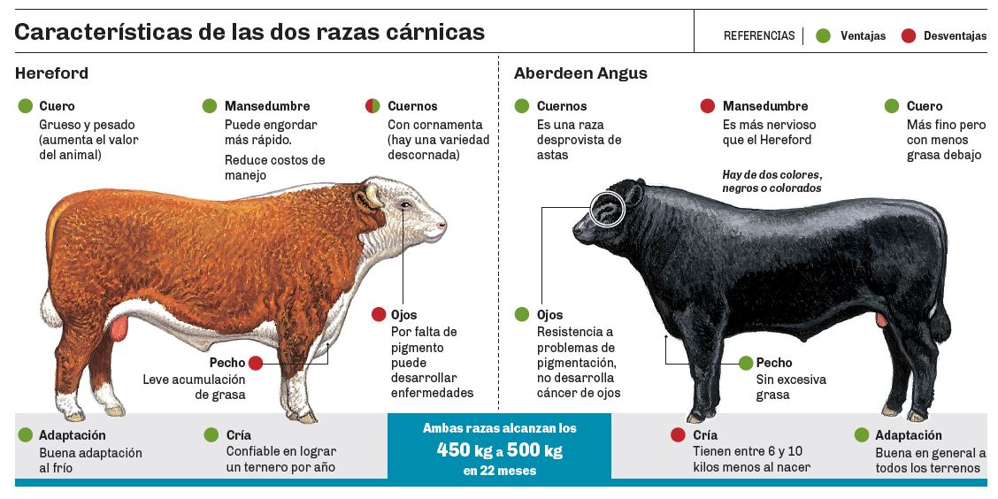 La ganadería del este rionegrino, donde se concentra poco más del 80% de la producción bovina que motoriza la provincia, cuenta con dos razas de animales bien definidas y dominantes como lo son Angus y Hereford. Sus criadores se disputan el territorio buscando prevalecer, como lo hacen los fierreros con las marcas Ford o Chevrolet. De uno y otro lado defienden las razas desde aspectos técnicos, comerciales, sanitarios, pero también desde la pasión, como los seguidores de las dos marcas automotrices. La selección del tipo de reproductor depende exclusivamente de los gustos de los ganaderos.