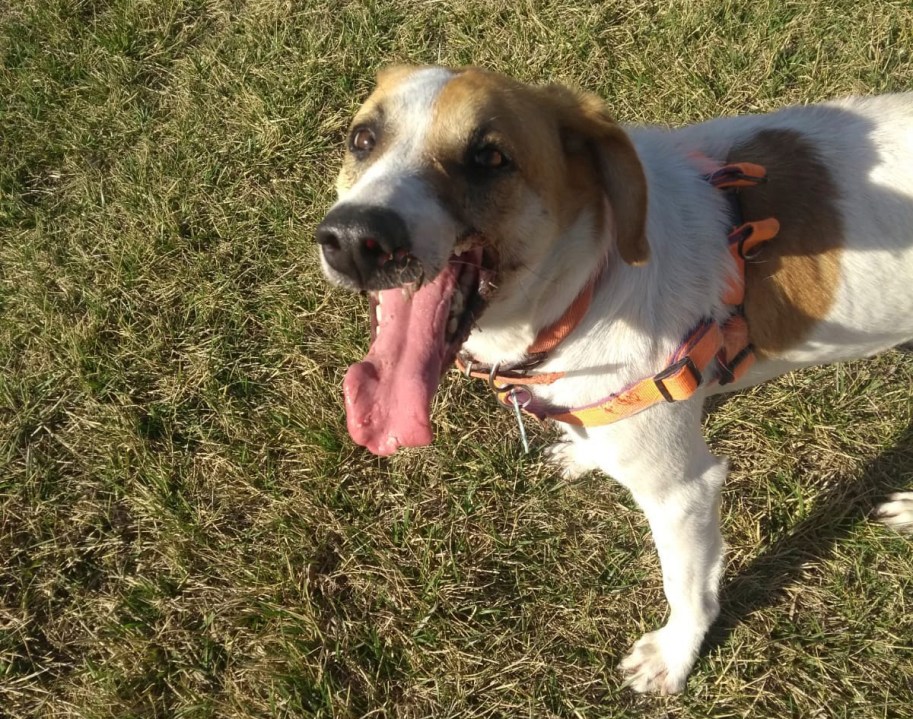 Chester aún es un perro joven, de tamaño mediano que, apenas rasguña los 2 años de edad. Su expresión de picardía en sus ojos de color marrón claro es encantadora y muy vivaz. De pelaje corto, blanco con manchas canela le da clase y se distingue aún más entre el resto de sus amigos perrunos. Tiene un buen caracter, además es muy activo, enérgico y sociable con otras especies.