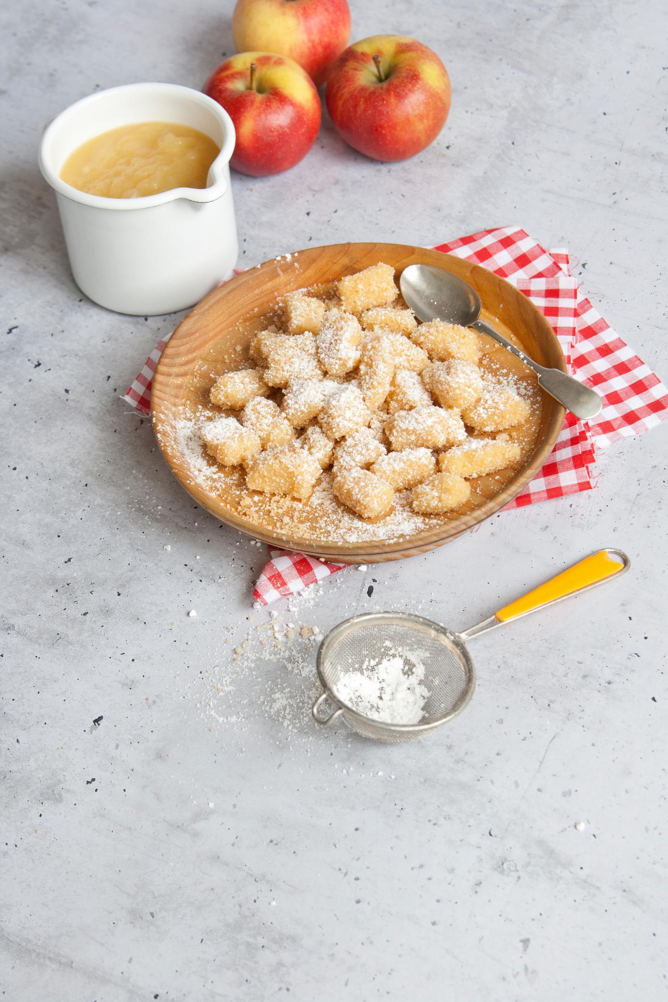Otra opción es con puré de manzanas: hay que preparar la masa con 250 gramos de ricota, 150 gramos de harina de trigo, un huevo, una yema y una pizca de sal. Una vez hervidos, dorarlos con manteca, azúcar y pan rallado. Una vez listos, servirlos con puré de manzana.