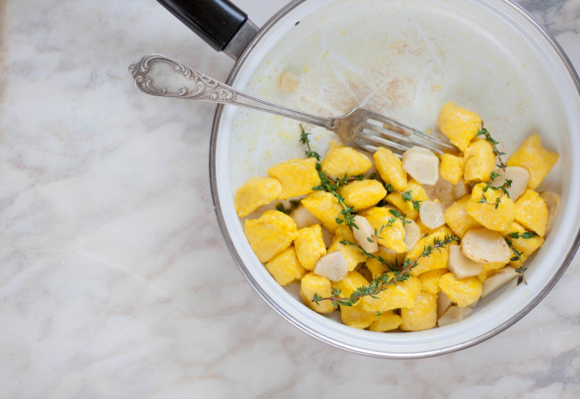 Otra variante de ñoquis sin papa es con calabaza. Simplemente hay que cortarla en trozos y hornearla unos 20 minutos a 200 grados. Esto hace que la calabaza se seque y la masa quede más firme, de modo que no se necesite tanta harina (cuanta más harina se le agrega menos blanditos quedan los ñoquis: atento a esto). Hacer un puré, añadir el resto de los ingredientes y amasar.