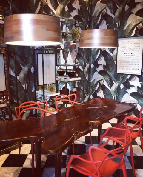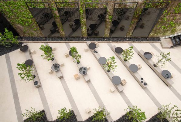 Los bancos largos con tapas de mesas del material llamado dektonsa, súper resistente al rayado y manchas; apto para exteriores.